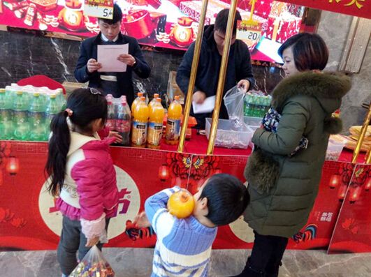 給長輩們選好了禮物,也要給寶貝們選禮物啦。榮泰廣場年貨節(jié)就為小朋友們精心準(zhǔn)備了好喝可口的橙汁、雪碧和可樂,還有小的時候的愛——大白兔奶糖。現(xiàn)場的小朋友,更是手提一袋糖果,肩扛一瓶橙汁,儼然一副小大人的模樣。