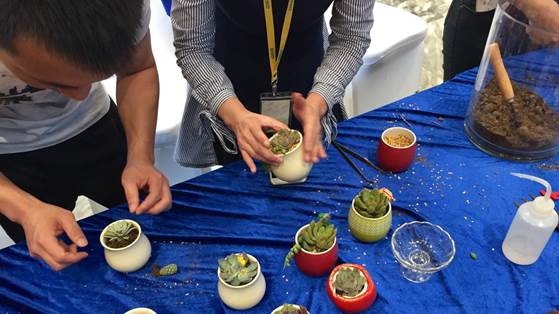 平時(shí)忙于工作的參與者,沒(méi)有充裕的時(shí)間親自動(dòng)手,看到這些植物早已迫不及待地開(kāi)始選盆、培土、植株,一派其樂(lè)融融。大家紛紛自己現(xiàn)場(chǎng)DIY一盆盆多肉植物,然后帶回家。