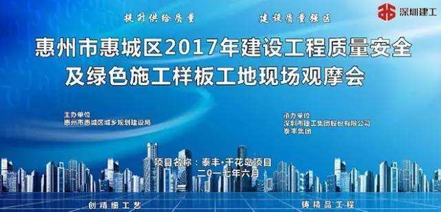 6月8日上午,由惠州市惠城區(qū)城鄉(xiāng)規(guī)劃建設(shè)局主辦,深圳市泰豐投資集團(tuán)有限公司、深圳市建工集團(tuán)股份有限公司承辦的——“惠州市惠城區(qū)2017年建設(shè)工程質(zhì)量安全及綠色施工樣板工地現(xiàn)場(chǎng)觀摩會(huì)”,在惠城區(qū)金山湖泰豐·千花島項(xiàng)目舉行。